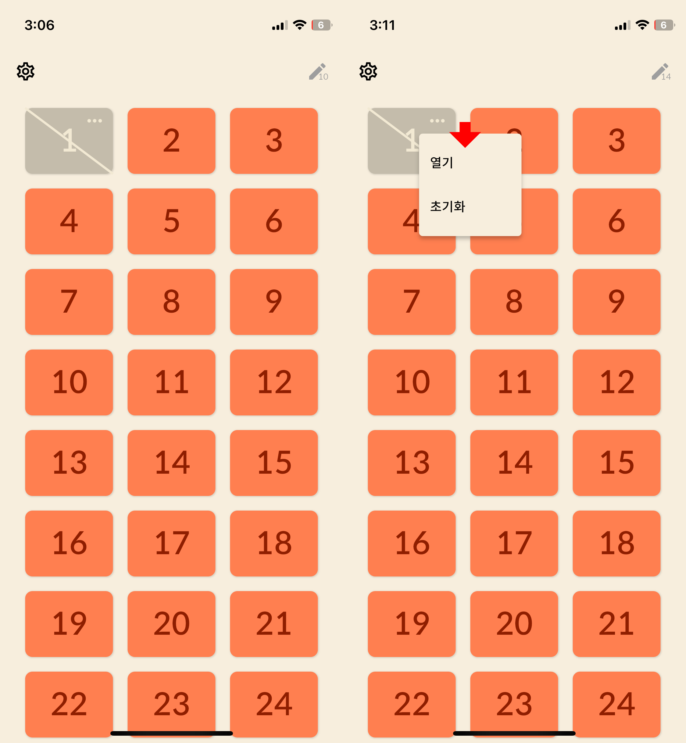 어쨌든 1번 문제를 맞혀서 홈 화면에서 1번 번호판이 지워져 있습니다. 점 3개 메뉴를 열어 다 맞춘 정답의 화면을 열어볼 수도 있고 초기화시켜서 문제를 다시 풀어볼 수도 있습니다.