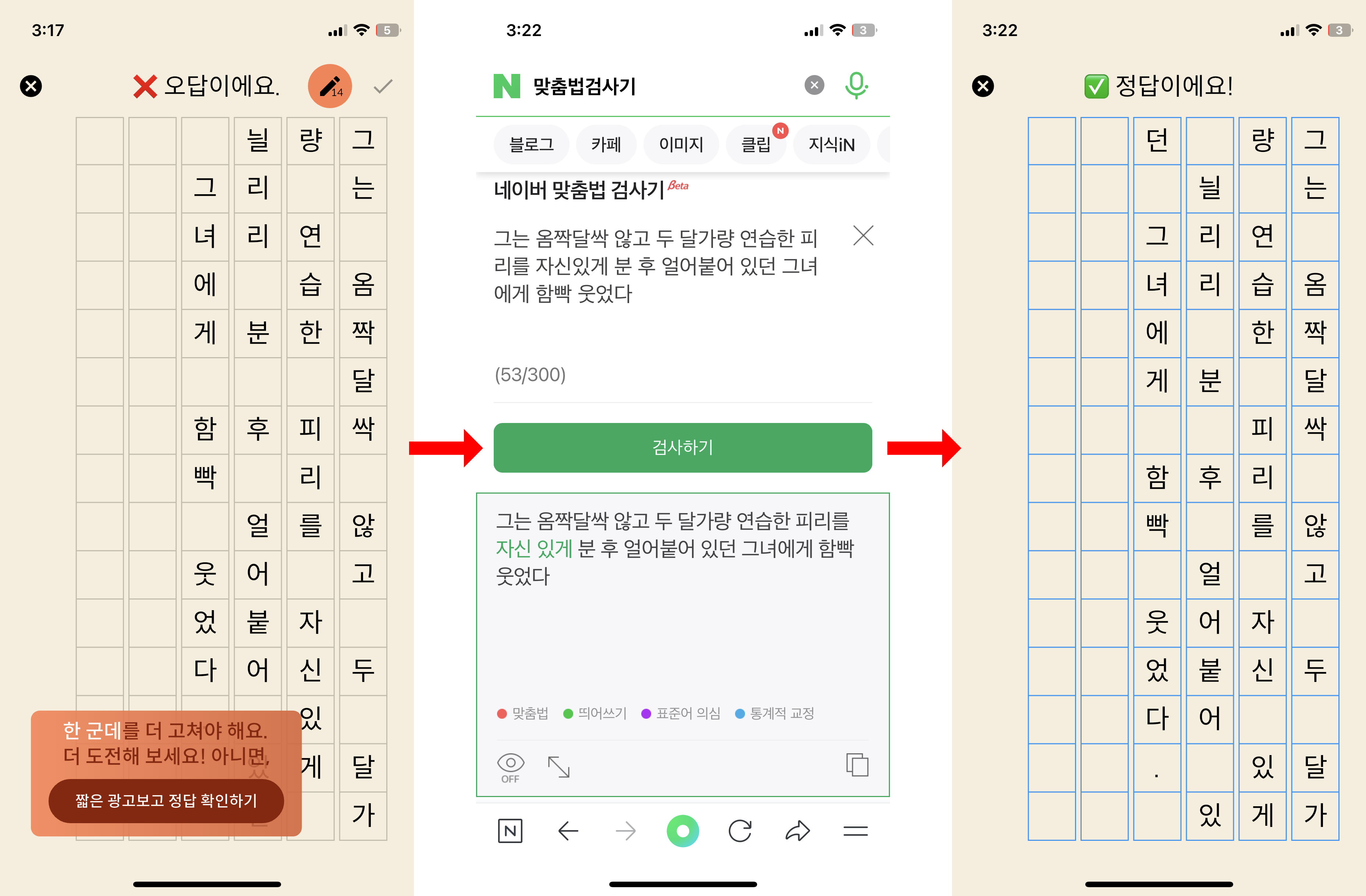 틀리면 '짧은 광고보고 정답 확인하기' 팝업이 뜨는데 그것을 이용하지 않고 네이버 맞춤법 검사기를 이용해 봤습니다. 자신 있게를 띄어 써야 하는 부분은 정말 어려웠습니다. 보조 용언 '있다'는 띄어 씀이 원칙이라고 합니다. 그리고 ' 두 달가량'에서 '가량'을 붙여 쓰는 것도 어려웠습니다. '-여' / '-쯤' / '-가량'과 같은 접미사는 앞말과 붙여 쓴다고 합니다.
