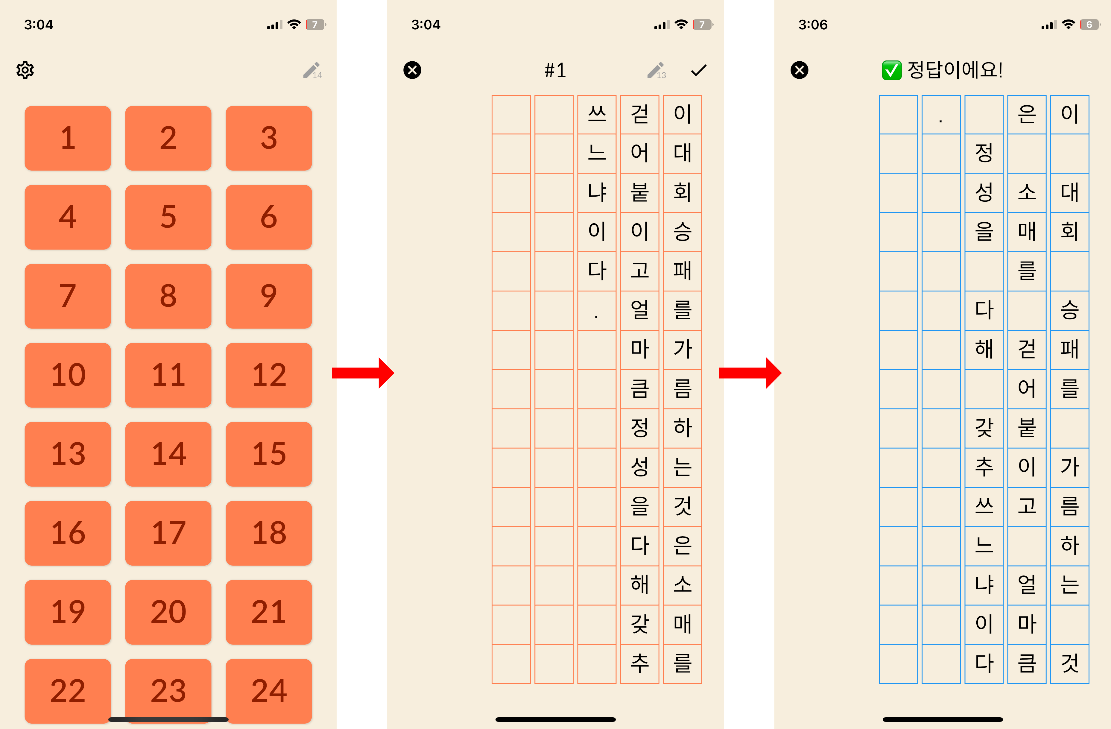 '한글 띄어쓰기' 앱을 다운로드하고 실행하면 첫 화면에 번호들이 뜹니다. 각 번호들을 열어 문제를 불어나갑니다.