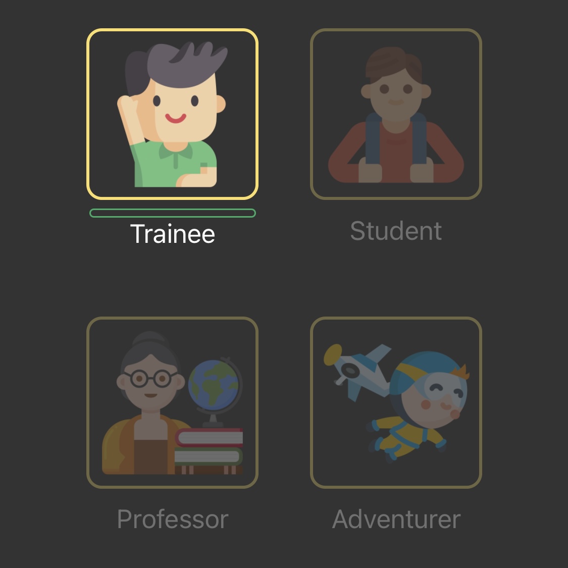 그리고 다음 화면에는 도전할 수 있는 레벨이 표시됩니다. 처음에는 Trainee 레벨이고 가장 쉬운 문제를 풉니다. 영국(United Kingdom), 미국(USA), 이탈리아(Italy) 등 쉬운 나라들로 11개의 나라의 국기를 맞춰야 합니다. 이 레벨을 가뿐히 통과하면 다음 레벨인 student가 열리고 조금 난도가 올라갑니다. student 레벨을 깨면 professor 레벨이 열리고 높은 레벨에 차례 차례 도전할 수 있게 됩니다.